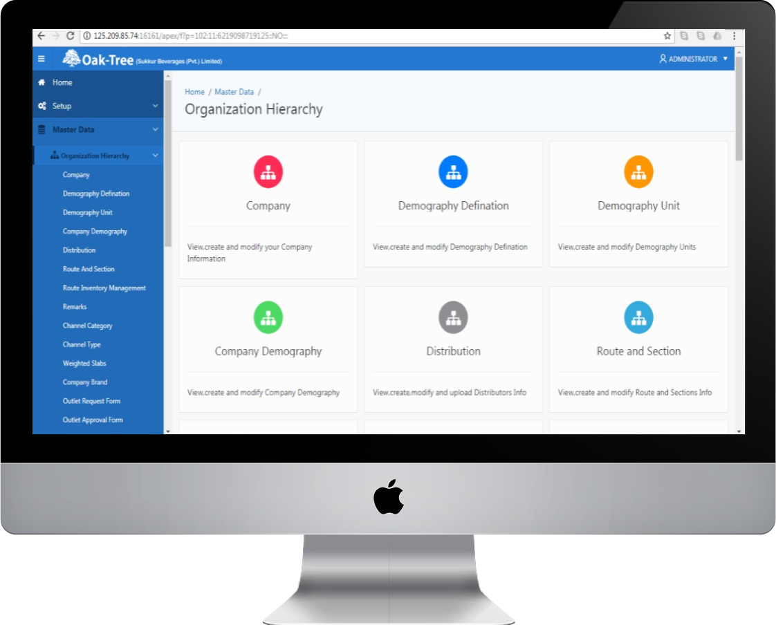 Oak-Tree portal is browser based application which facilitates manufacture to enter master data like, company, product & employee hierarchy. Maintain prices, discounts and schemes for distributors and retailer etc. It also facilitates distributors to enter their daily business transaction to control their day to day business.